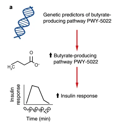 这个研究首次在人体中找到了,肠道菌群与胰岛素抵抗以及2型糖尿病之间的因果关系。即:丁酸可以促进餐后胰岛素分泌;而粪便中丙酸含量的增加,会提高2型糖尿病的风险。